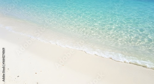 Tranquil turquoise water gently laps onto a pristine white sand beach under a clear sky, evoking a sense of peace and natural beauty