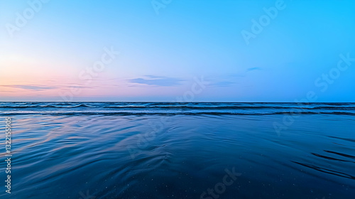 Tranquil Twilight Seascape With Pink and Blue Gradient Sky Over Calm Ocean Waves on a Sandy Beach at Golden Hour