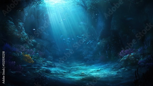 Tranquil Underwater Scene: Sunlit Ocean Depths with Coral Reef Ecosystem