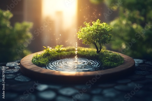 Tranquil Water Feature with Lush Greenery and Peaceful Atmosphere