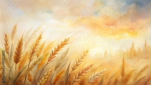 Tranquil watercolor landscape of golden wheat fields under a soft sky, capturing the essence of harvest and warm summer days with copy space