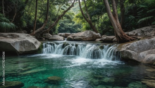 Tranquil waterfall cascading into a clear stream surrounded by lush greenery and rocks in a serene forest environment.