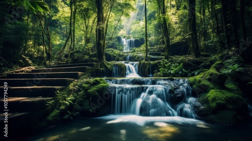 Tranquil waterfall nestled in the dense greenery of a Thai forest