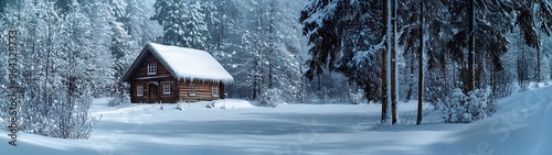 Tranquil Winter Retreat: Cozy Rustic Cabin in Snowy Forest Panorama