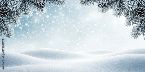Tranquil Winter Snow Scene with Frozen Pine Branches and Light Snowfall in Background