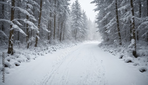 Tranquil winter wonderland path through snow-covered forest under soft gray skies