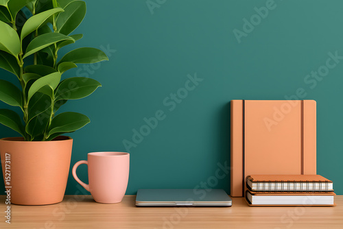 Tranquil Workspace Composition: A modern workspace with an elegant indoor plant, cup, laptop, and books, blending serenity with productivity, perfect for a contemporary aesthetic.