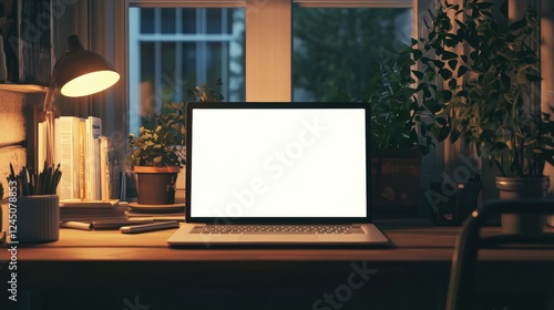 Tranquil Workspace with Laptop Glowing Screen Books and Indoor Plants Creating Calm Home Office Vibe