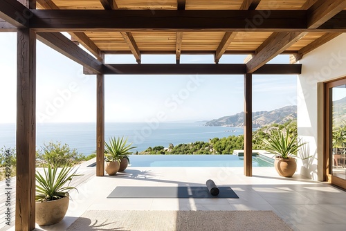 Tranquil yoga mat overlooking infinity pool and ocean view