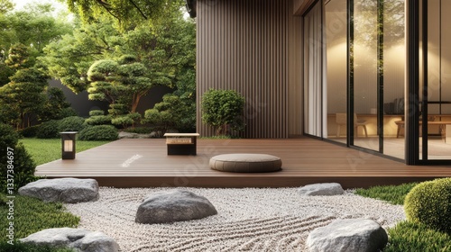 Tranquil Zen Garden Design: Modern Japanese Home Exterior with Serene Landscaping