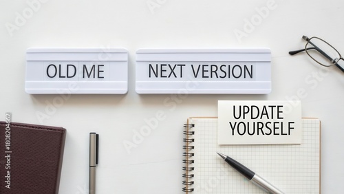 Transformation and Self-Improvement Concept with Note on Desk Depicting Old Self and Next Version for Personal Growth