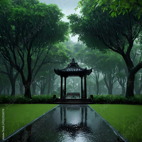 transformation of a rain-soaked park into a haven of seclusion and introspection