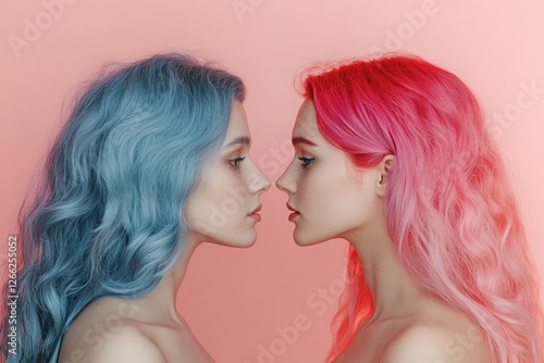 Transforming gray hair into vibrant colors with a side by side comparison of blue and pink hues in a creative artistic setup. Generative AI