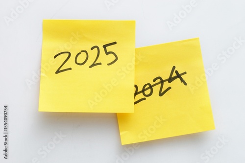 Transition from 2024 to 2025 shown on yellow sticky notes with the previous year crossed out, symbolizing the New Year change