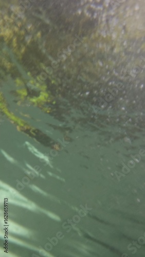 Transition of abstract underwater view scenes, looking up towards the surface with sunlight filtering through water, rocks, and ripples. Natural aquatic background with a mysterious feel.