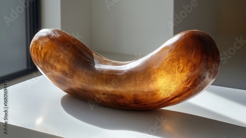 Translucent Amber Abstract Sculpture with Organic Curves, Illuminated by Natural Light on a Minimalist White Surface