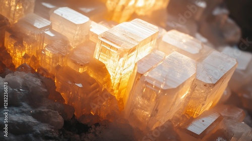 Translucent crystals illuminated by warm light create a stunning natural display in an undisturbed setting