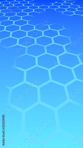 Translucent honeycomb on a gradient blue sky background. Perspective view on polygon look like honeycomb. Isometric geometry. Vertical image orientation. 3D illustration