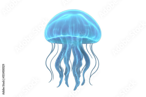 Translucent marine creature pulsing softly, luminescent blue tendrils trailing through dark underwater environment, glowing with otherworldly radiance