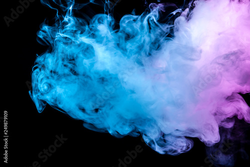 Translucent, thick smoke, illuminated by light against a dark background, divided into three colors: blue, green, pink and purple, burns out, evaporating from a steam of vape for print on t-shirt