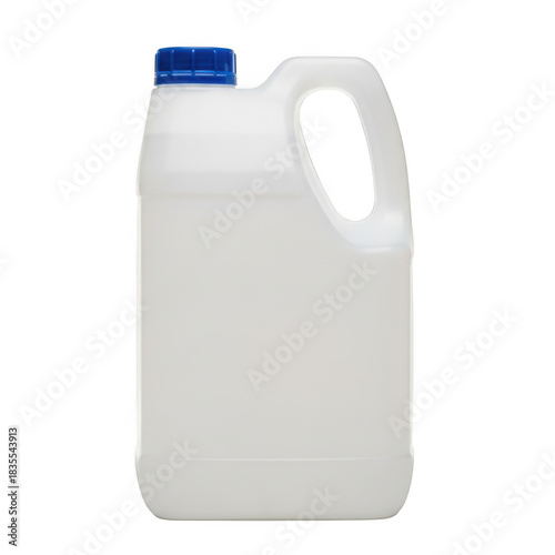 Translucent white plastic jerry can with a blue screw cap and integrated handle, isolated on transparent background