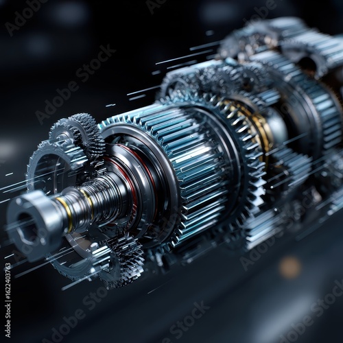 Transmission gearing system on blur background. Mechanics, engineering, transport use