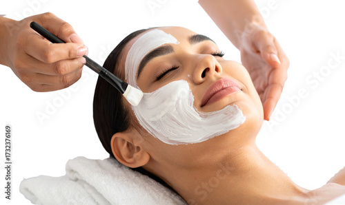 Transparent Background Beautician Applying White Cream Facial Mask with Soft Brush on Relaxed Woman, Close-Up View, Isolated