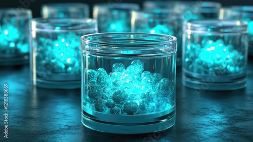 Transparent biocontainers with glowing cells, symbolizing rejuvenation.