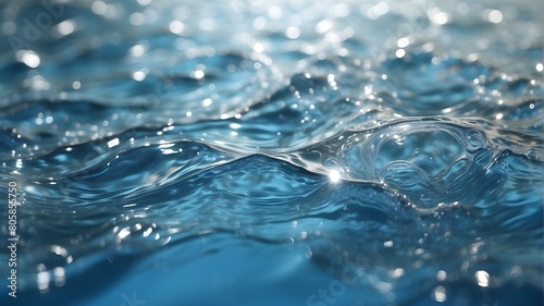 Transparent blue clear water surface texture with ripples, splashes and bubbles. Abstract summer banner background Water waves in sunlight with copy space Cosmetic moisturizer micellar toner emulsion