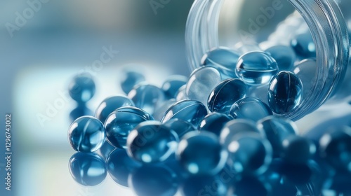 Transparent blue gel capsules spilling from open container on smooth surface.
