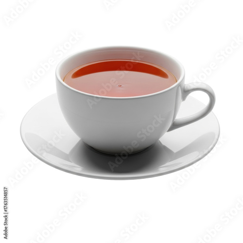 transparent ceramic teacup with vibrant amber tea on matching saucer, isolated against seamless transparent background with soft diffused shadows, high key lighting, concept of comfort and