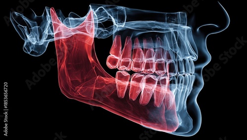 Transparent dental scan shows highlighted jawbone and teeth in 3D render