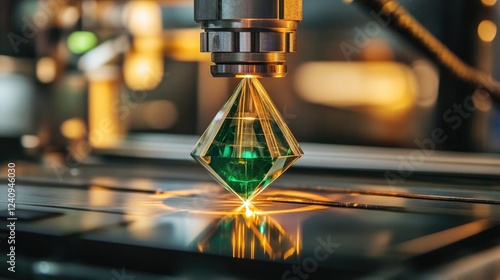 Transparent gemstone-cutting process with a laser cutter sculpting a raw emerald.