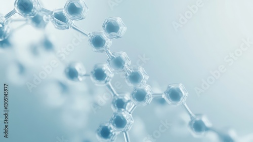 Transparent glass molecular structure model on soft blue background with copy space for scientific or medical concept