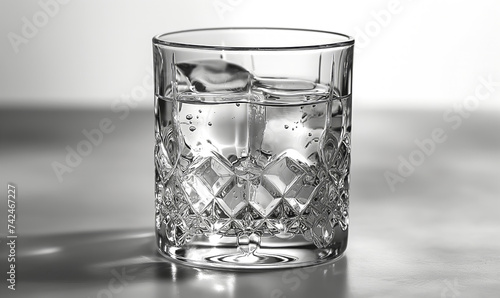Transparent glass with clear drink and ice cubes.