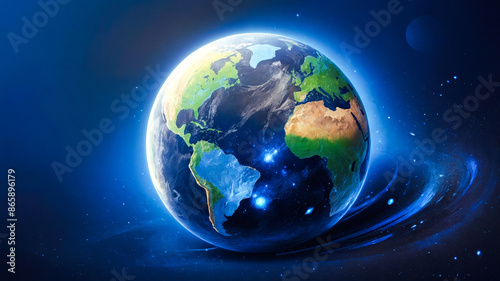 Transparent globe of Earth planet from blue glowing particulars on blue background