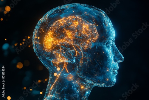 Transparent head profile, brain glowing