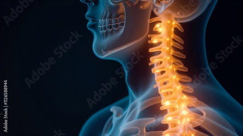 Transparent human figure showcasing a vibrant spine, illustrating various spinal stresses and disorders for medical insight