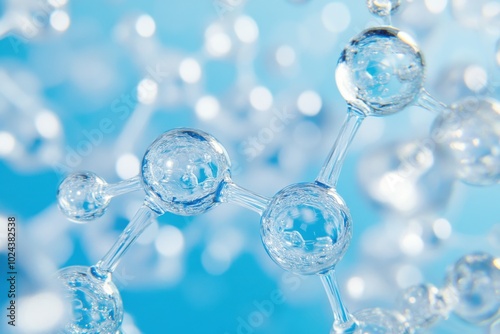 Transparent molecules are connected by thin bonds, floating in a fluid-like medium
