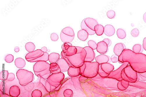 Transparent pink and gold watercolor drops on white background. Bubbles imitation.