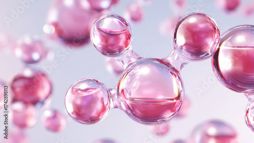 Transparent pink molecules floating in soft light, biotechnology and cosmetic science concept, peptide structure, nanotechnology, skincare innovation, molecular research and beauty treatment