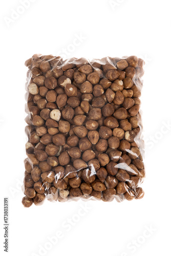Transparent Plastic Bag Filled with Whole Hazelnuts Isolated on White Background. Organic Nuts, Healthy Snack, Food Packaging and Natural Ingredient Concept