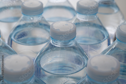 Transparent plastic bottles, containing water, next to each other. Use and recycling of plastic.