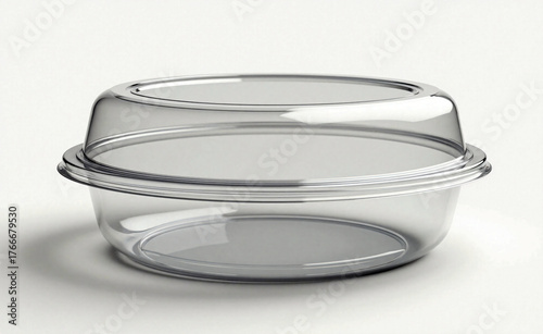 Transparent plastic food container with lid on light background, reusable or disposable storage packaging concept.