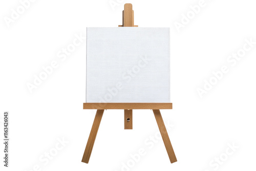 Transparent png background of wooden easel with blank white canvas art studio setting minimalist viewpoint