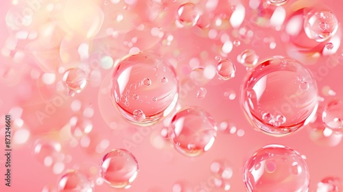 Transparent red gel drops with bubbles on pink background, displaying a cream cosmetic sample texture.