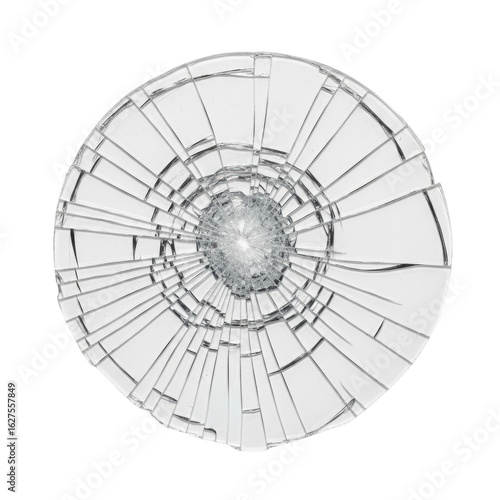 Transparent shattered glass with a central impact point and intricate spiderweb cracks radiating outwards, on a pure transparent isolated background with bright shadowless studio lighting. Concept