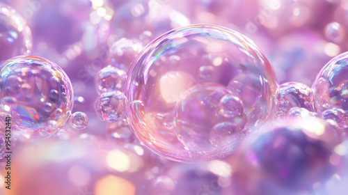 Transparent soap bubbles floating on a futuristic purple background, creating a dream and magic atmosphere. Cosmetic skincare product texture