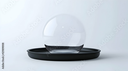 Transparent sphere on black tray, minimalist studio background, clean design, perfect for websites or product presentations