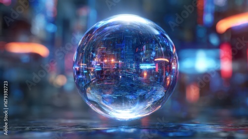 Transparent Sphere Reflecting Futuristic Cityscape with Vibrant Neon Lights and Bokeh.